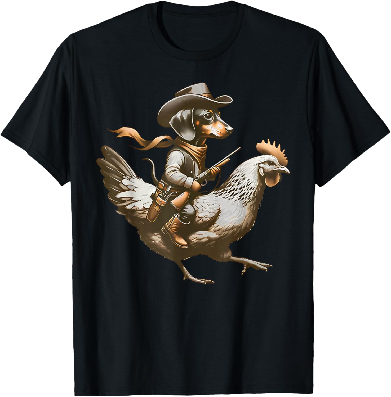Western Cowboy Dachshund Wiener riding a Chicken Farm Animal T-Shirt